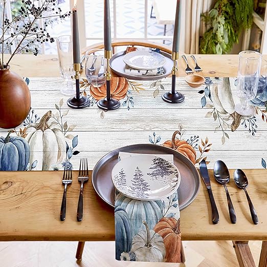 Fall Table Runner Blue Pumpkin Table Runners for Dining Room Leaves Floral Wood Grain Dinner Runner Thanksgiving Kitchen Decor 13" x 72"